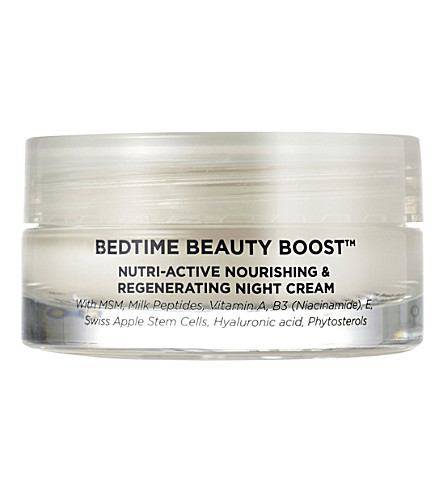 BN OSKIA Bedtime Beauty Boost Nutri Active Regenerating Night Cream 2ml Sample. Light in texture but rich in essential cell nutrients - including MSM Regen-Complex milk peptides vitamins A B3 and E Swiss apple stem cells hyaluronic acid phytosterols and omegas 3 6 and 9 - this non-greasy formula sinks in quickly no more ruined pillowcases where is sets straight. BEDTIME BEAUTY BOOST FULL INGREDIENTS.